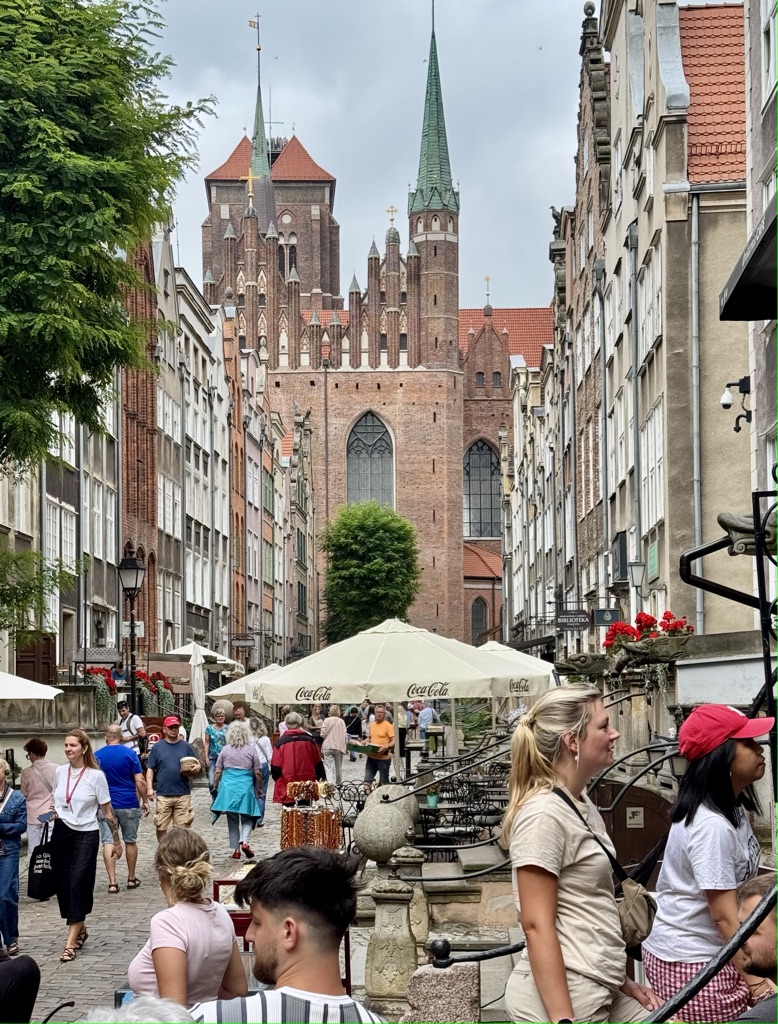 Gdansk, Poland. Among Poland’s many advantages are level land and access to the sea, two factors that make it attractive to agressive neighbors. The German invasion of Poland on September 1, 1939, marked the beginning of World War II. About 85% of Gdansk was destroyed during the war. We started our visit in Stare Miasto, the Old City, that showed times of great prosperity. On Saturday, July 26, Gdansk was full of activity–markets, trumpets, music!