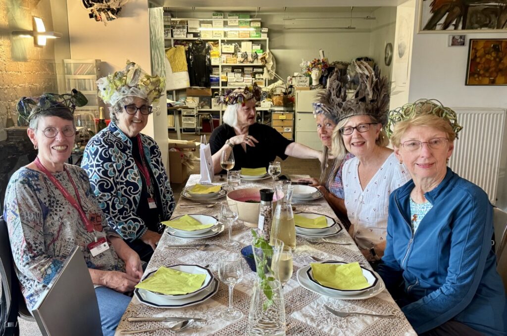 The next day was rainy. Some of us went by bus through the countryside and toured the opulent Rundale Castle, constructed in the 18th century by the designer of the Winter Palace in St. Petersburg. In this Rundale album, you can see its magnificence. Dinner was at the home of Brigida Stroda, a local designer who speaks English and enjoys meeting people. Here are my five companions wearing crowns she had created. She also created delicious beet soup and an innovative salad. We had a great time.