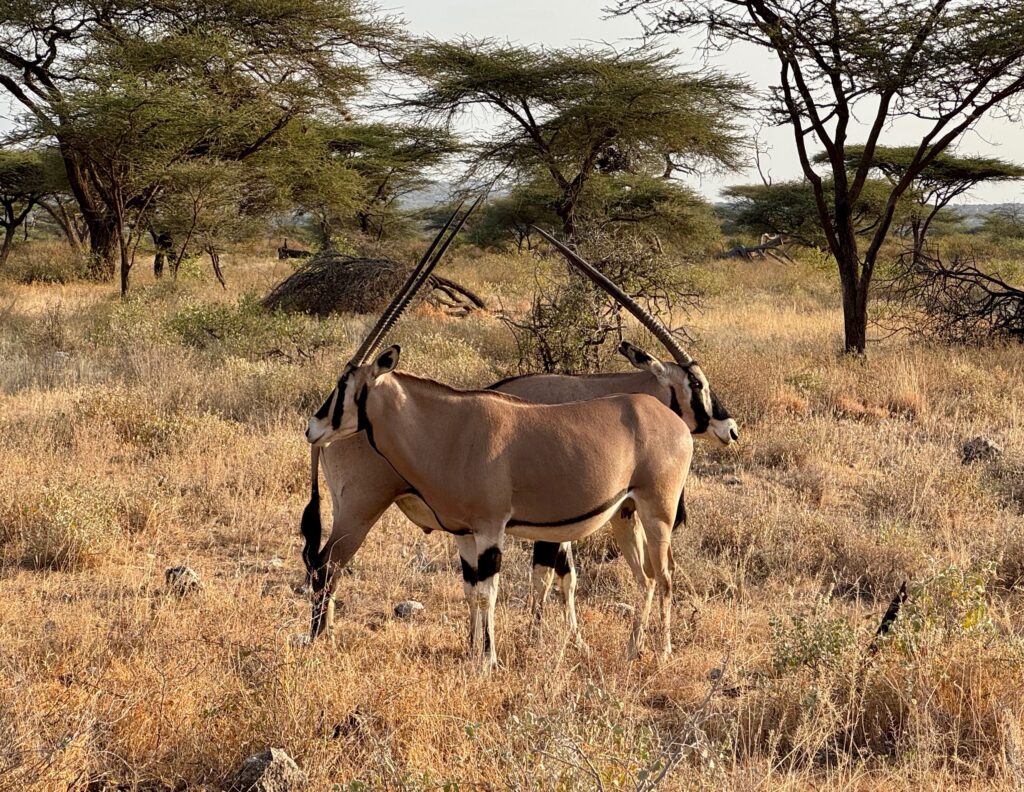 Our journey that day took us past Mount Kenya to the Ashnil Samburu Camp in Isiolo. There we saw Grevy’s Zebra, the largest member of the zebra family with narrow black strips on a background of white, covering the entire length of the legs down to the hooves. We would see multitudes of Common Zebras elsewhere in Kenya, but the Grevy Zebras only here. And we saw the Beisa Oryx and herds of elephants, always looking out for their young. There were no orphans here.