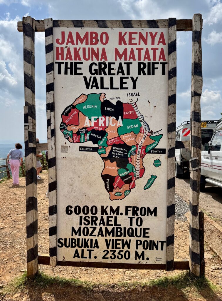 In Kenya, a sign welcomes visitors to the Rift Valley, which extends 6000 kilometers along the eastern edge of Africa, from Israel to Mozambique. It is a massive land depression that was formed by plate tectonics about 25 million years ago. Olduvai Gorge, a World Heritage Site in the Tanzania part of the Valley, is called the “Cradle of Mankind” because it is believed to be where remains of the first human beings were found.