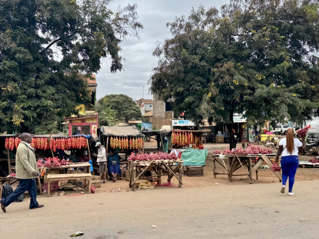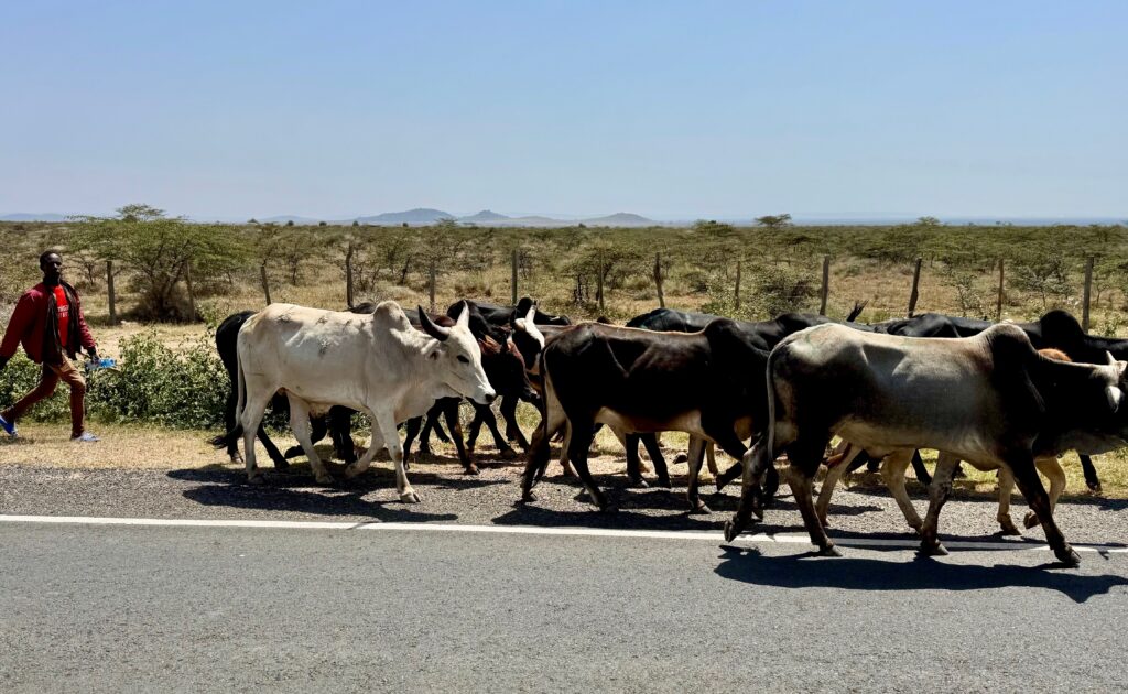 A 240-mile drive north from Nairobi on June 21 took longer than it would have at home. Kenyans are so accommodating and easy-going that they erect very few traffic signals. Instead, they have many speed bumps along the highways. This system seems to work pretty well; I saw no accidents. Speed was just not a priority. Our drivers were remarkably skilled in passing closely and yielding right of way. Next to every highway we saw sheep, goats, and cattle in small herds and many roadside vendors.